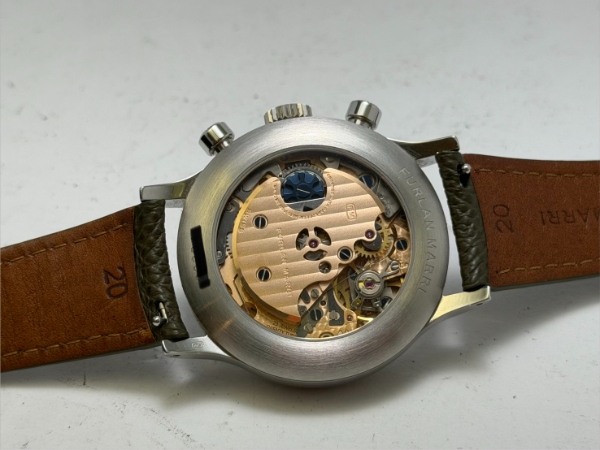 38 毫米的不鏽鋼錶殼沿襲了 1940 與 1950 年代的復古設計語彙,包含了經典的『Tasti Tondi』(圓形防滑刻紋)計時按把。每一枚腕錶在 6 點鐘位置的錶耳間均刻有獨立編號。機芯配備了導柱輪(Column-wheel)以驅動飛返計時功能,並提供 63 小時的動力儲存。