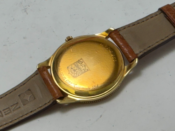 在 90 年代初期到中期我們才看得到的美(這款錶誕生的年代),一個反白而成的四角星,星星的四個角向外延伸出細長的尖端(像是一個閃爍的星芒),在星星下方,是 "ZENITH" 的全大寫字體;這個字體並非現代那種粗壯的無襯線體,而是帶著極細微裝飾線(Serif)的襯線體,看起來非常纖細優雅。