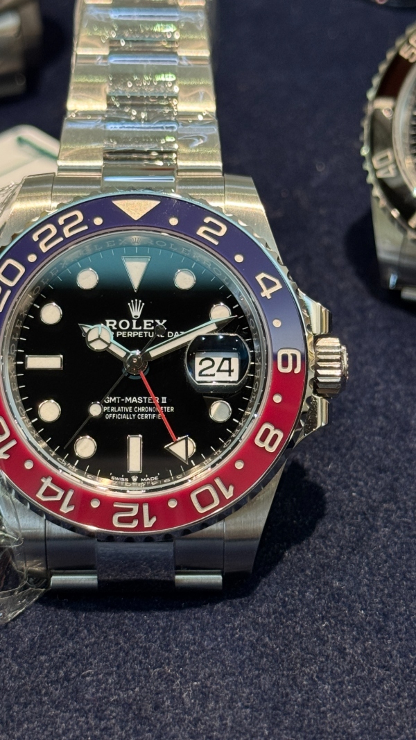 GMT-Master II 最大的魅力,就是它的雙時區顯示功能。主時針顯示本地時間,24 小時制的紅色 GMT 指針搭配可旋轉的雙色鉑金 PVD 陶瓷錶圈(質感實屬上乘 大拇指),能輕鬆讀取第二時區,甚至能透過旋轉錶圈設定第三時區——對於飛行員、商務人士或熱愛旅行的人們來說,這項功能相當實用!
