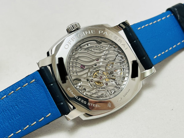 Radiomir Mediterraneo 系列,腕錶以義大利地中海為靈感,採用沉靜的藍做為主調,從錶面、錶帶至特別設計的藍寶石水晶透背,有宛如海浪般的波紋裝飾;小三針的佈局,配合米色三明治刻度呈鮮明對比,透著海洋的神秘感及吸引力。