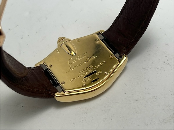 Roadster 特別的酒桶外型,加上 Cartier 特色的數字面盤設計,讓人感到非常優雅,面盤中間鐵軌形秒數標記較外圈的時標低,做成高低不同的區域,是蠻具特色的做法;