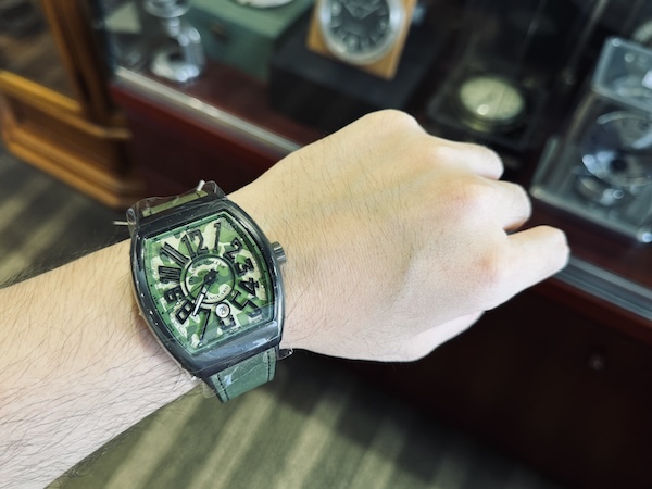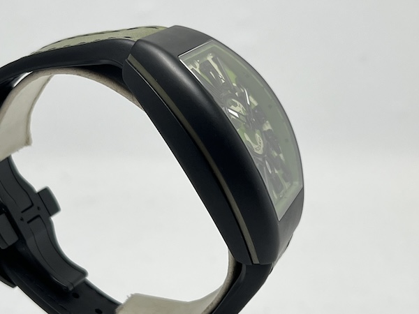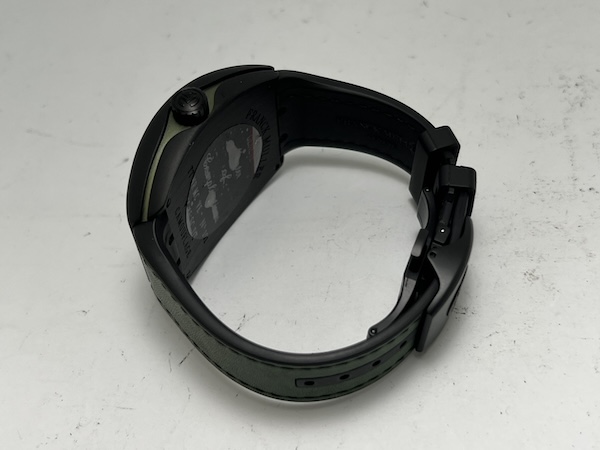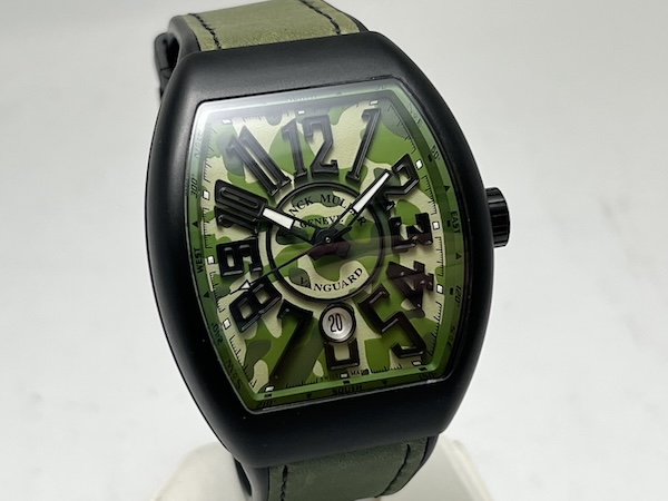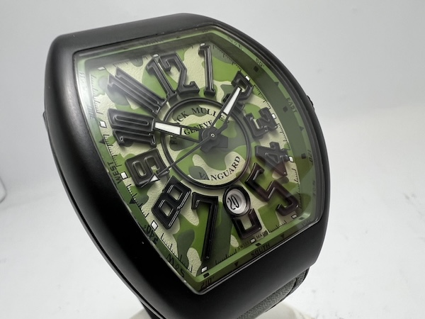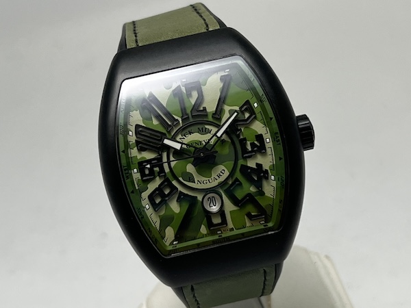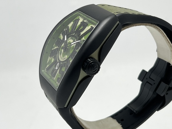 Franck Muller Vanguard Camouflage 系列代表了品牌對運動風格與軍事時尚的全新詮釋,此款 V 45 SC DT TT NR MC VE 搭載品牌標誌性的 Vanguard 酒桶型錶殼,尺寸達 44 x 53.7mm,展現出極具存在感的陽剛外型;整只由鈦金屬(Titanium)材質製成,結合黑色 PVD 塗層,既輕盈又堅固,增強耐磨性。