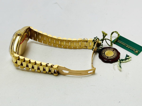 原裝 18KYG President 錶帶已翻修,原裝錶帶頭及原裝摺疊錶扣皆未動。原廠錶盒及保證書, "W" 字序號,品相非常良好。