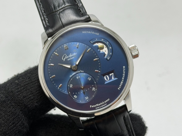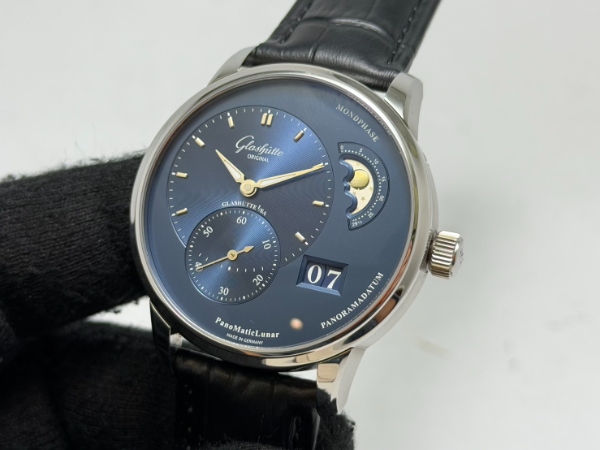 值得一提的是,這款偏心月相腕錶上完美的藍色調,由 Glashutte Original 位於德國普福爾茲海姆 (Pforzheim) 的自有錶盤廠經驗豐富的團隊精心打造。這藍色是來自對電鍍過程的嚴謹監控、加上 40 個生產步驟的精準規劃才換來最完美的藍色調。此外這些普福爾茲海姆專家們最讓人欽佩之處,還有他們替位於 2 點鐘位置的月相顯示所特別打造的優雅造型 — 銀色夜空襯托著銀色月亮和繁星。