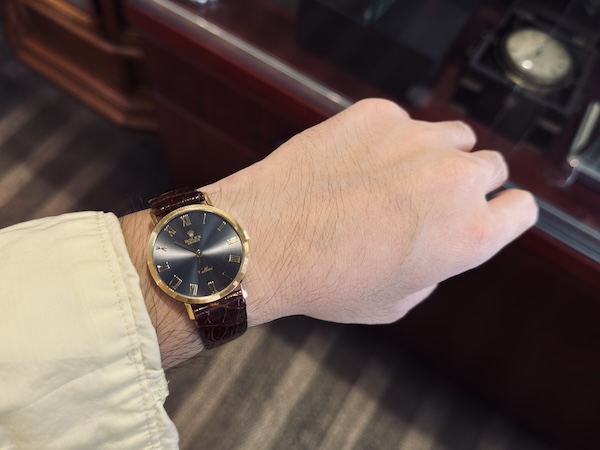 錶殼採用 18K 黃金(型號末碼 /8 代表黃金材質)製成,直徑約 32mm,厚度纖薄,佩戴在手腕上極為服貼。錶殼線條細緻,搭配細坑紋錶圈與拋光錶耳,整體比例完美,展現出一種低調的貴族氣息。