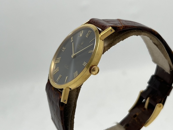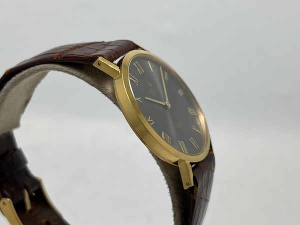Unisex. Cal.1602 手動上鏈,時分針指示。Slate w/ Roman hour markers, Non-Luminous hands & indexes.