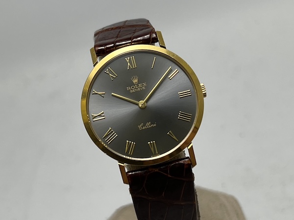 面盤為深灰色(Slate Dial),搭配羅馬數字時標(Roman hour markers),以白色印字與灰面形成優雅對比;指針為細長 Dauphine 形,延續了 1970–80 年代 Cellini 的經典語彙。這種設計風格完全跳脫運動錶的陽剛感,更接近歐洲古典正裝時計的精神。