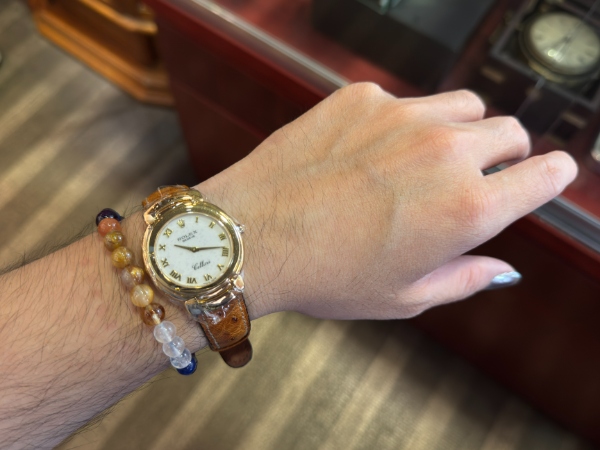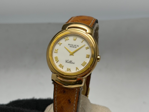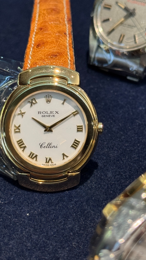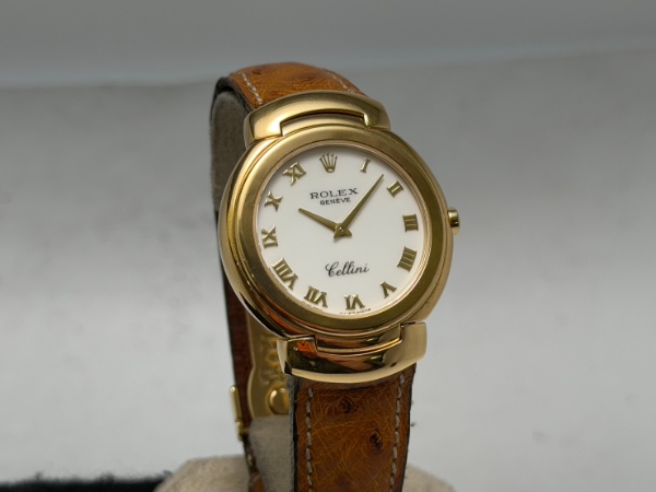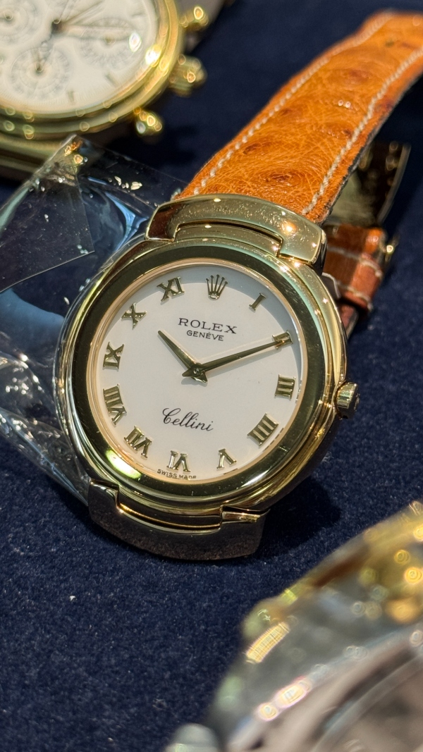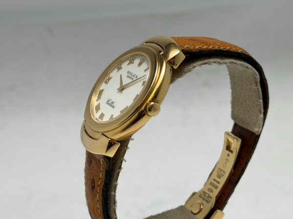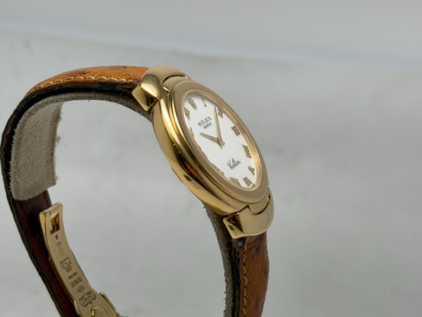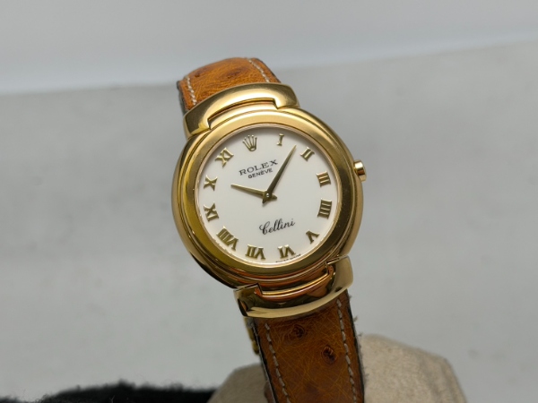 勞力士的徹利尼系列以貴金屬和寶石、奢華錶帶和精緻錶盤為主要特色,今天介紹的 6683 是 Cellini Danaos 系列的成員之一,擁有素雅的象牙白面盤,佐以原廠 18K 黃金製成之羅馬數字時標,其他部份如錶圈和錶耳部份的末端鏈環均同樣為原裝 18K 黃金製成之。